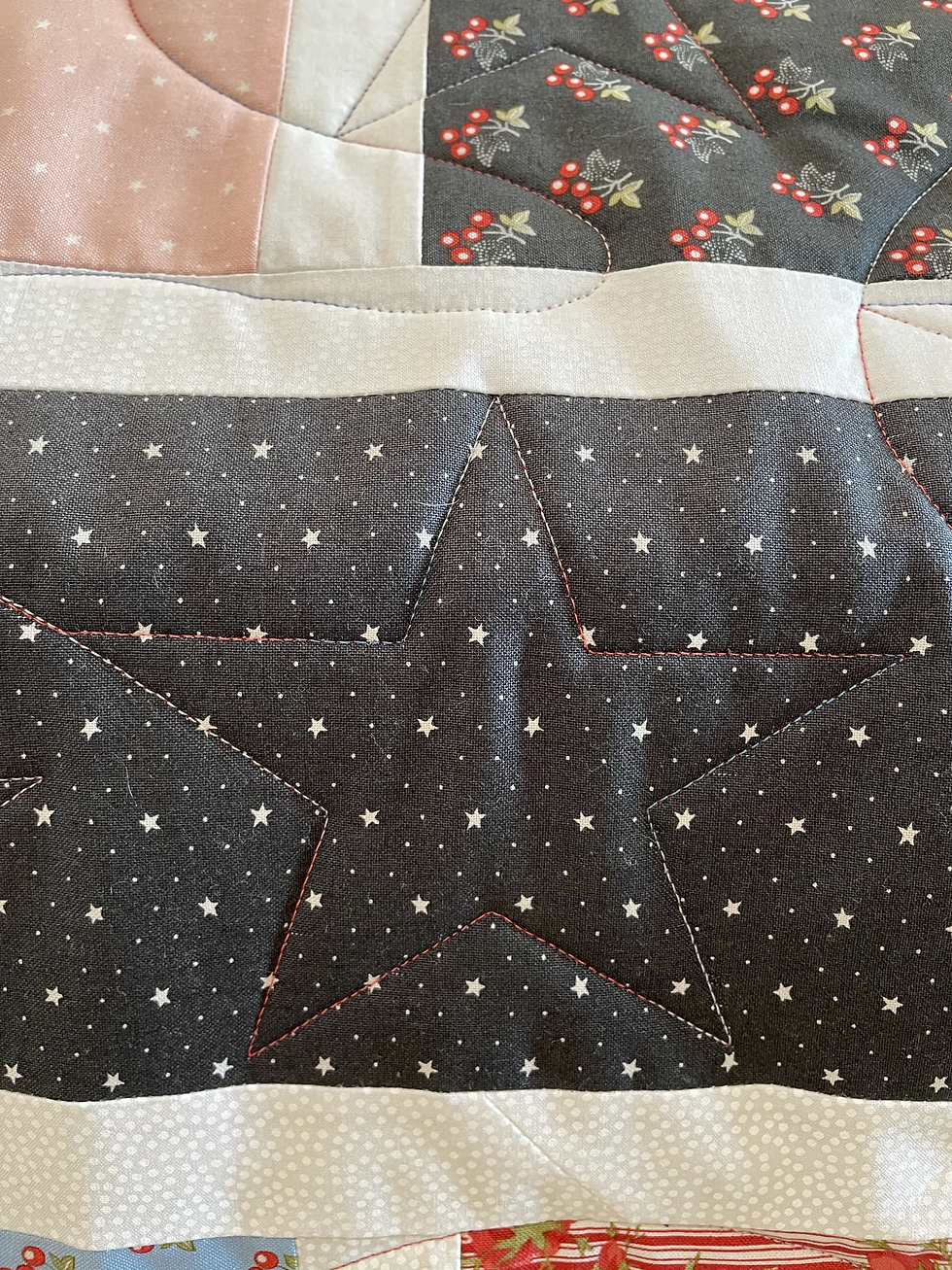 The quilting is with red, white and blue variegated thread in a pattern called Simply Stars by Urban Elementz. It turned out amazing and was just what Blake was looking for. The back is a bright blue minky fabric to snuggle up with and it gave it some amazing weight for those cold nights, maybe I didn't think that one through since this is a July themed quilt oops!